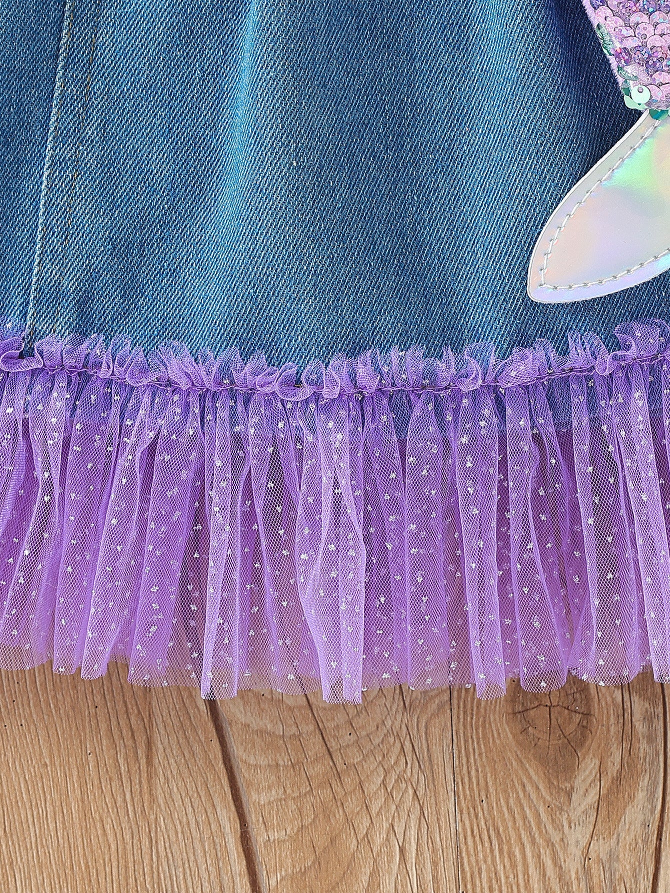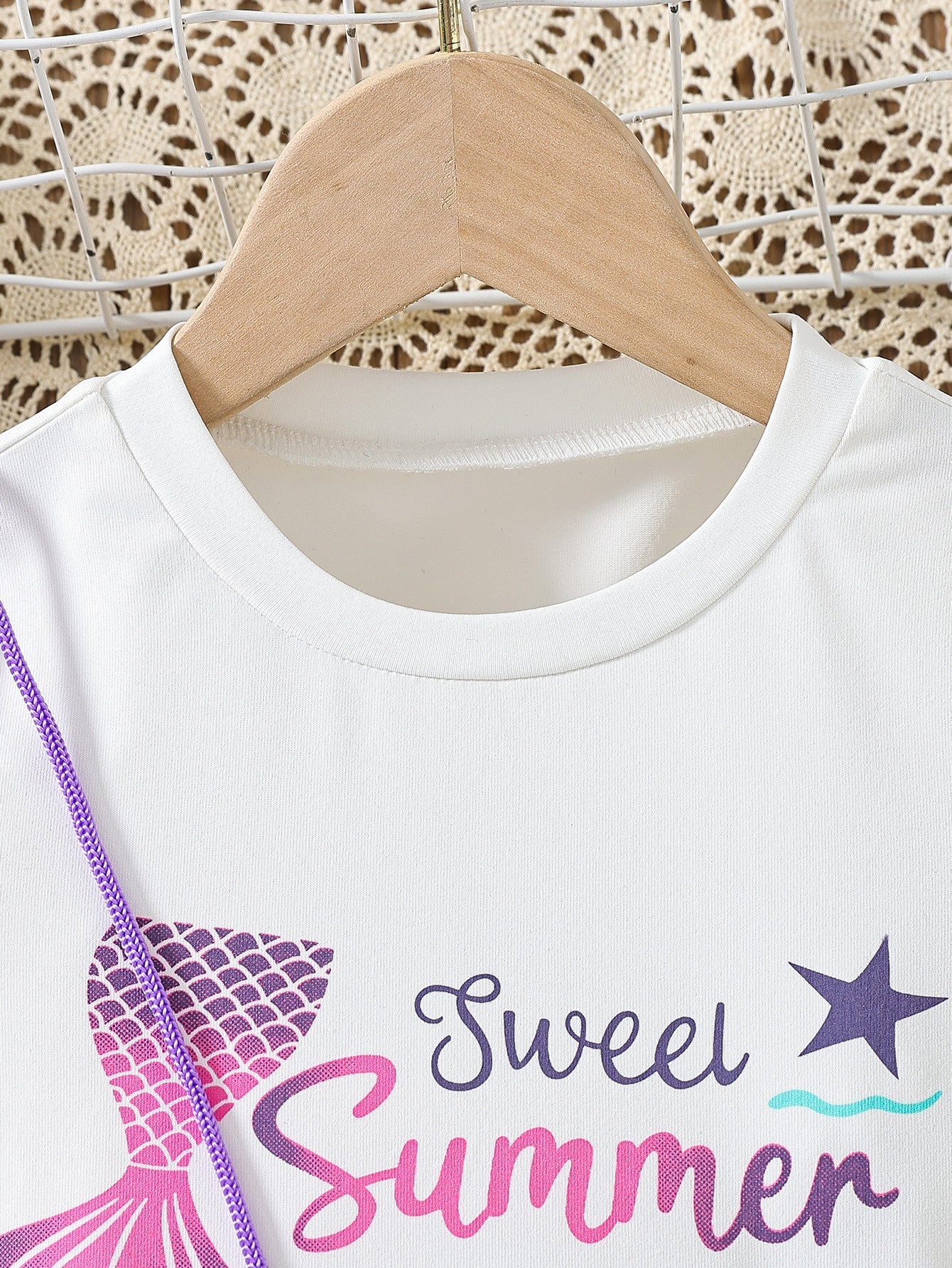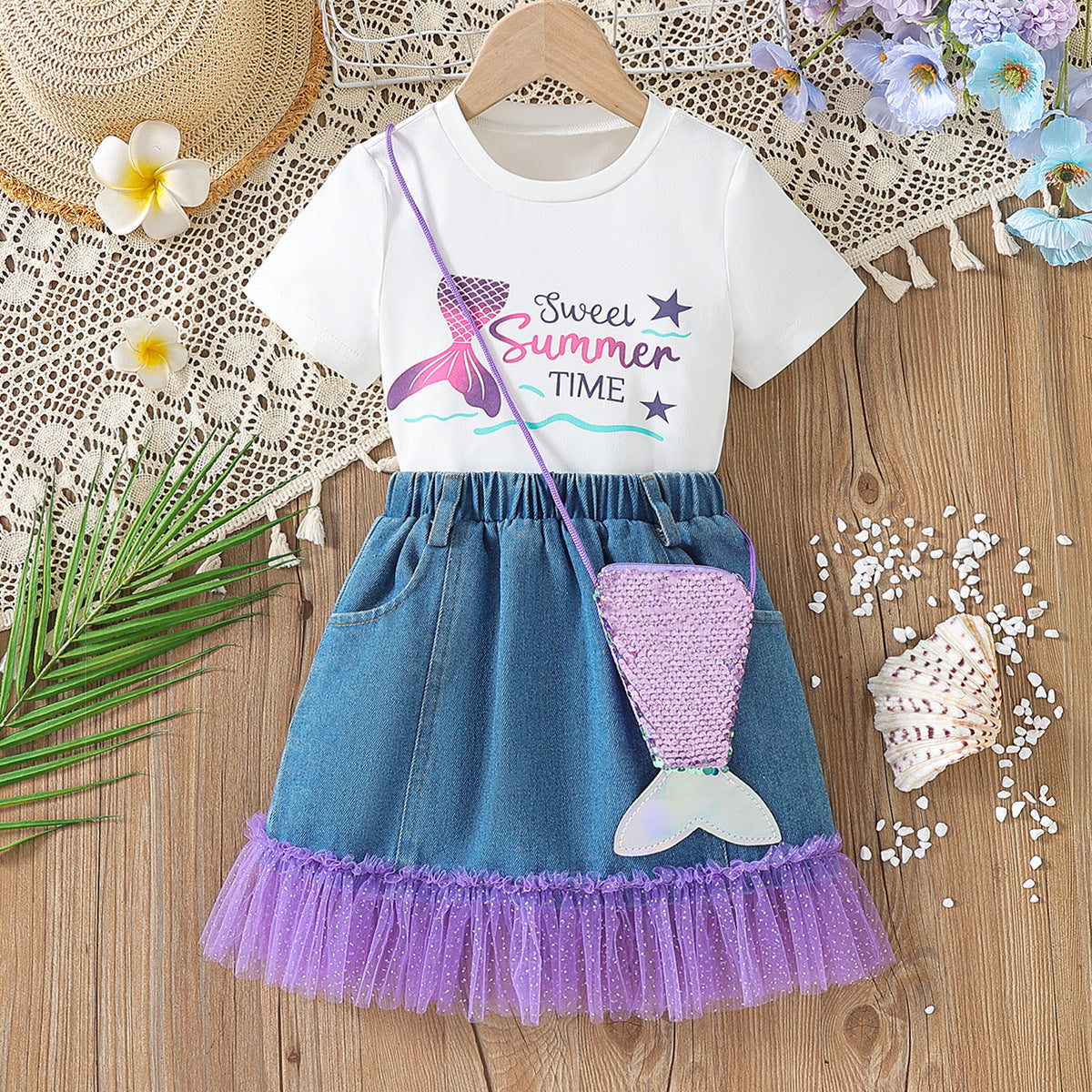 Mermaid T-shirt + Mesh Stitching Denim Skirt + Bag