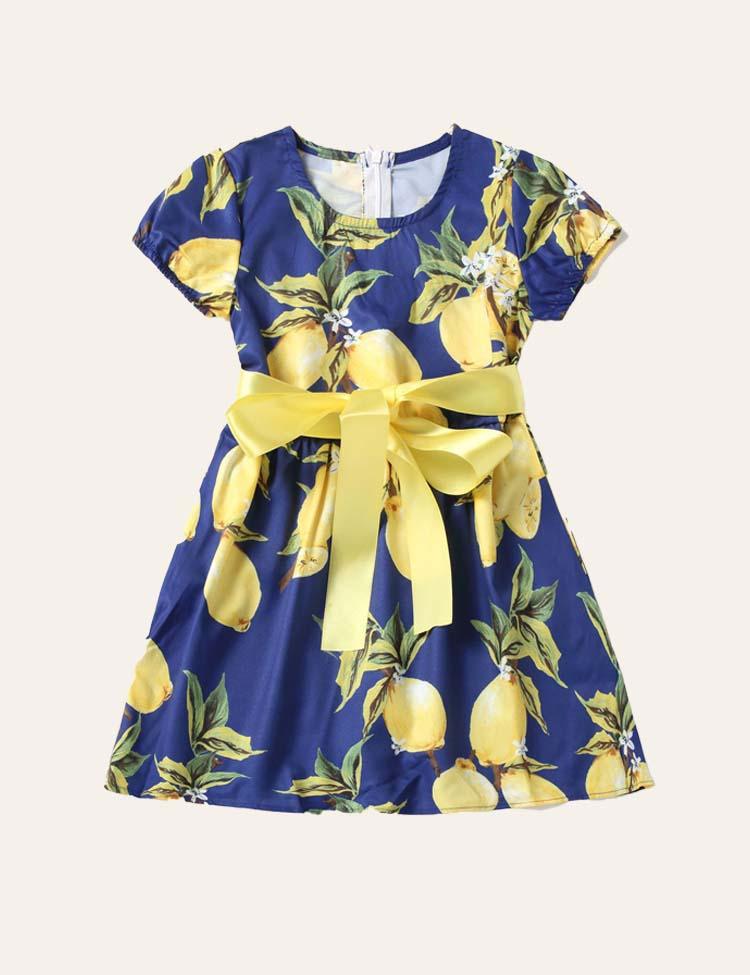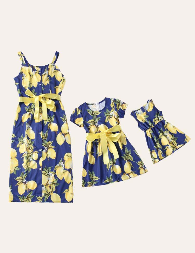 3Pcs Family Matching Lemon Floral Bow Print Belted Slip Dress